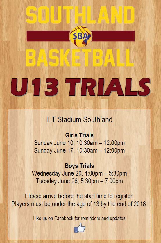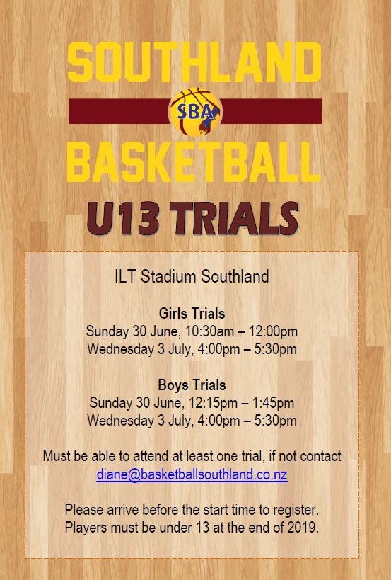 Southland Basketball has set the dates for the representative trials for Girls and Boys Under 15, Under 17 and Under 19 Squads. All trials will be held at ILT Stadium Southland.